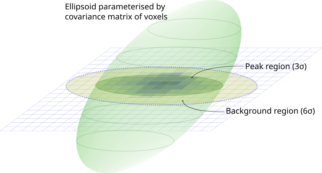 Fixed ellipsoid — The peak region is defined by the “mean radius” of the covariance ellipsoid in pixels; this is simply the mean of the half principal axes of the ellipsoid. The background begin and background end are scaling factors, which multiply the peak region.