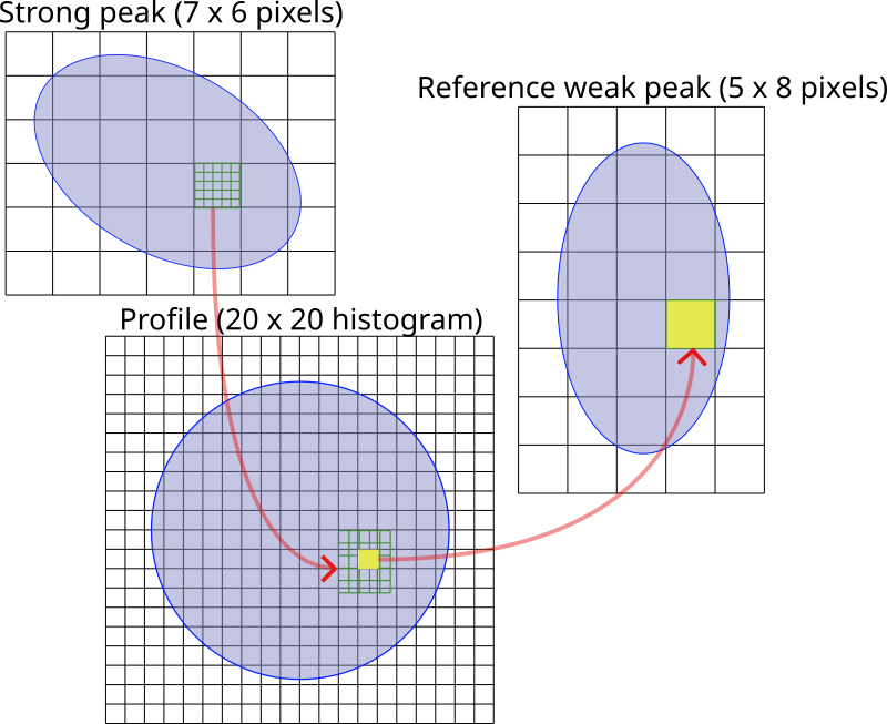 The image above demonstrates the process of generating and fitting profiles in practice. One or more strong peaks in the neighbourhood of a weak reference peak are averaged over histogram with a different grid. In the image, a strong peak with a 7 x 6 pixel bounding box is binned on a 20 x 20 histogram, which is normalised after adding all of the neighbouring peaks. In practice, each pixel of a strong peak is subdivided on a finer mesh, in this case, a 5 x 5 subgrid, and 1/25 of the pixel signal is added to the relevant histogram bin. This results in smoother profiles. When profile integrating a weak peak, the profile value of pixel \(i\), \(p_i\), is taken from the nearest histogram bin.