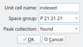A list of candidate unit cells is shown. If you were careful when adjusting the direct beam, it should be quite easy to find the correct unit cell. In this case, the cell parameters are 54.97 58.53 67.58 90 90 90. The space group in this case is \(P2_12_12_1\), which corresponds body-centred orthorhombic Bravais lattice (oP in the table). Again, the ability to find the correct Bravais lattice and centring is crucial, and strongly dependent on the direct beam position. In the screen shot, we can see that the hightlighted solution has a quality of 100%, meaning that 100% of peaks in this collection can be indexed using this unit cell. Select the best solution and click Assign selected unit cell to open the following dialogue.