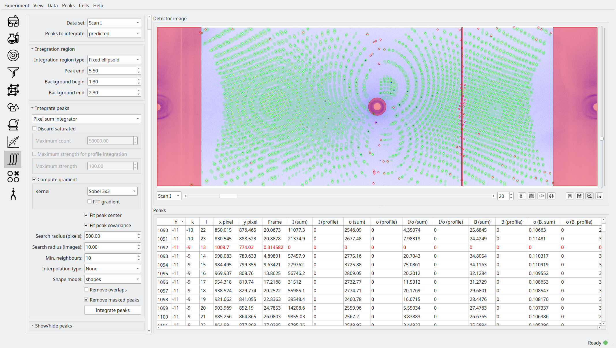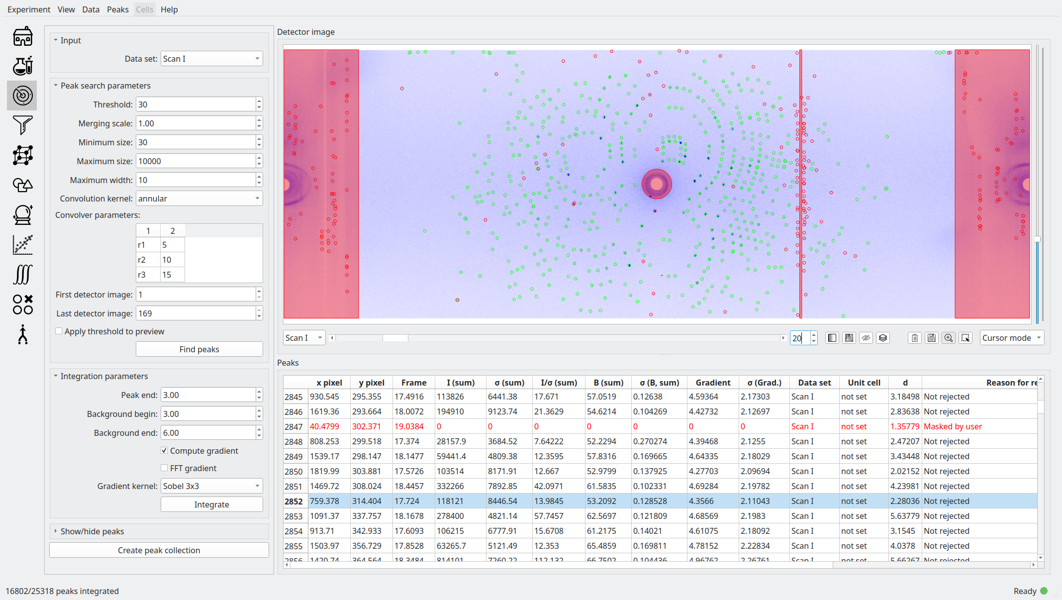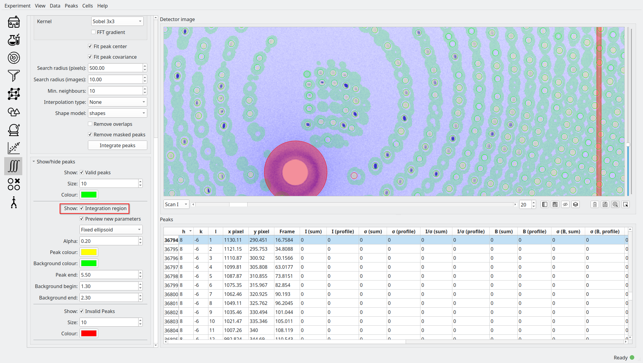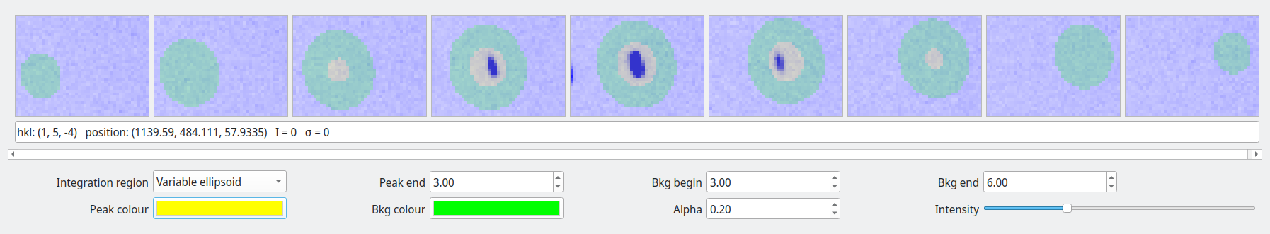 Note that clicking the peak on the detector image also superimposes the integration region for that single peak with the parameters (peak end, background begin, background end) specified in the parameters widget on the left. The peak region is in yellow, and the background region in green.