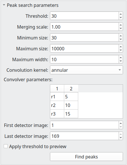 The most important peak finder parameter is the threshold, which determines the minimum number of counts for a pixel to be in a peak region; in this case, we have decreased it from the default 80 to 30 in order to have more peaks to construct a shape model. If our detector images had too few peaks to generate a convincing shape model, we could decrease it further, and also decrease the Minimum size. The danger in doing this is, of course, that including very weak peaks will degrade the quality of our shape model later on. Minimum size and Maximum size specify the minimum and maximum number of counts in a blob (i.e. a peak in real space); the latter is important because a blob with too many counts might be a heterogeneous background feature. Finally Maximum width defines the maximum number of frames over which a blob can extend. Leaving these parameters at their current values, click on Find peaks, and wait for the processing to finish (this may take a few minutes).