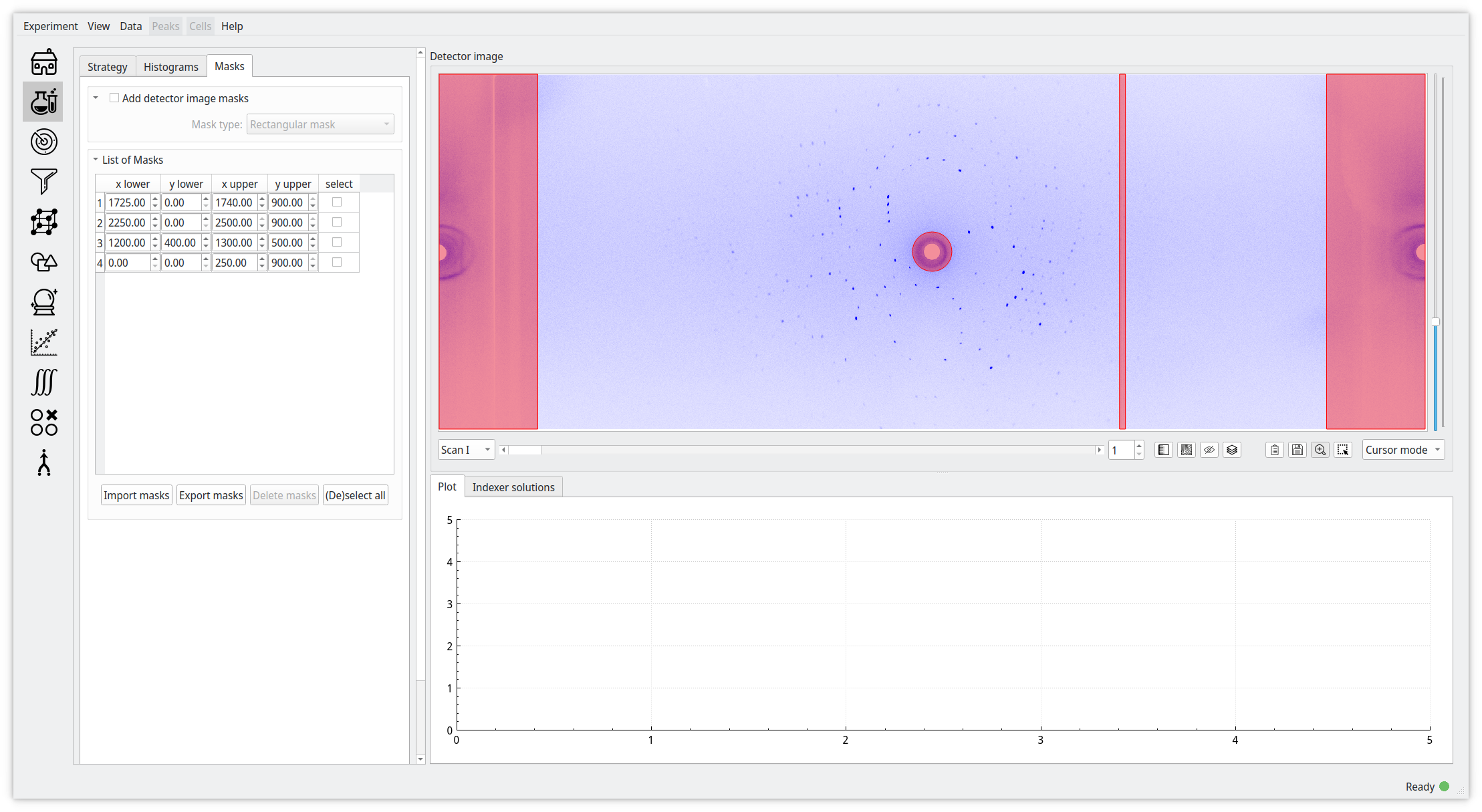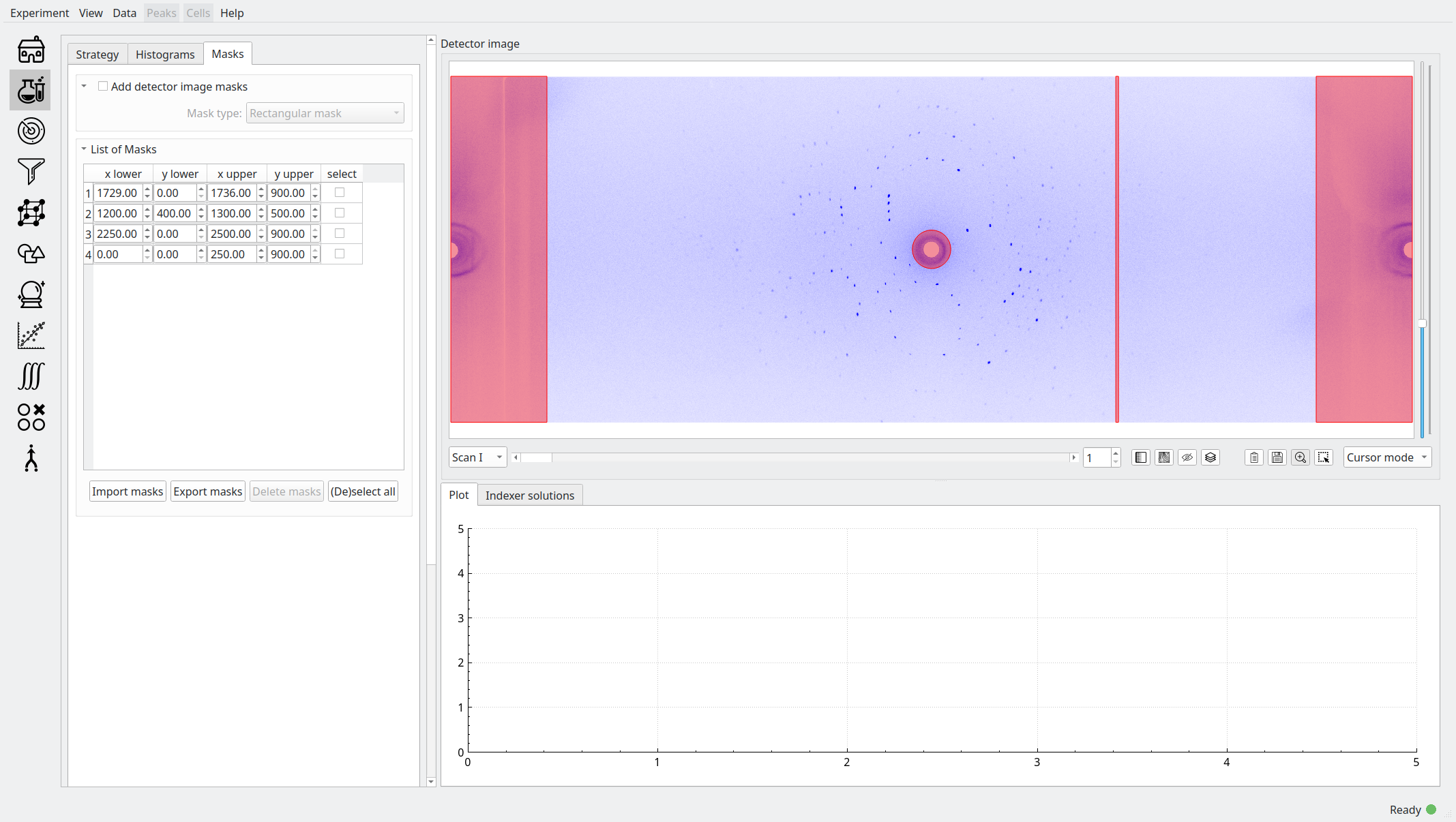 There are artifacts on detector image whose position is fixed regardless of the sample rotation angle, for example the beam stop and imperfections on the detector such as the seam between detector plates. We can ensure that peaks intersecting these artifacts are excluded from the final results by applying masks. A mask can be applied on any image, and will apply across the whole rotation range. Click on the Experiment icon on the sidebar, and click on the Masks tab. When the Add detector image masks box is checked, clicking and dragging on the detector image will add either a rectangular or elliptical mask depending on the state of the Mask type box.