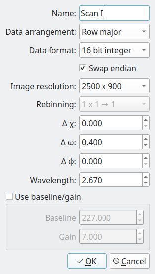 The data set consists of 167 images with a resolution of 2500 times 900 pixels, and the sample is rotated in increments of 0.4 degrees. The instrument used in this case is BioDiff []. Click on Create new experiment from the Home widget of OpenHKL, and select the BioDiff2500 instrument from the list in the resulting dialogue.