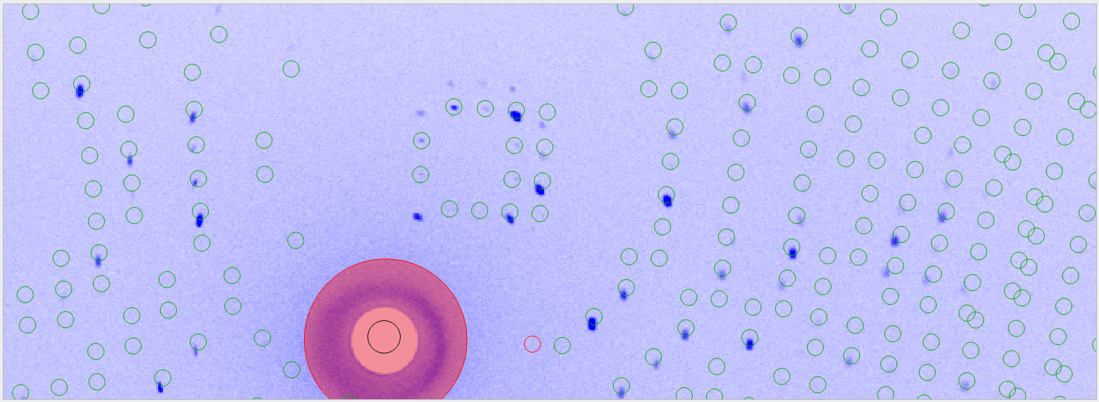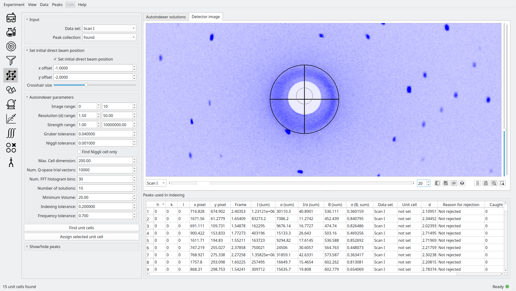 Here, the direct beam position has been moved by about one and a half pixels in the x and y directions, but even this tiny change has made a precipitous improvement in the ease with which we can index this data set (try it without setting the crosshair!).