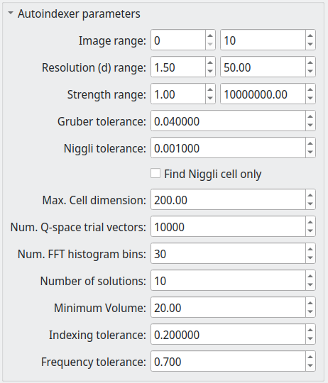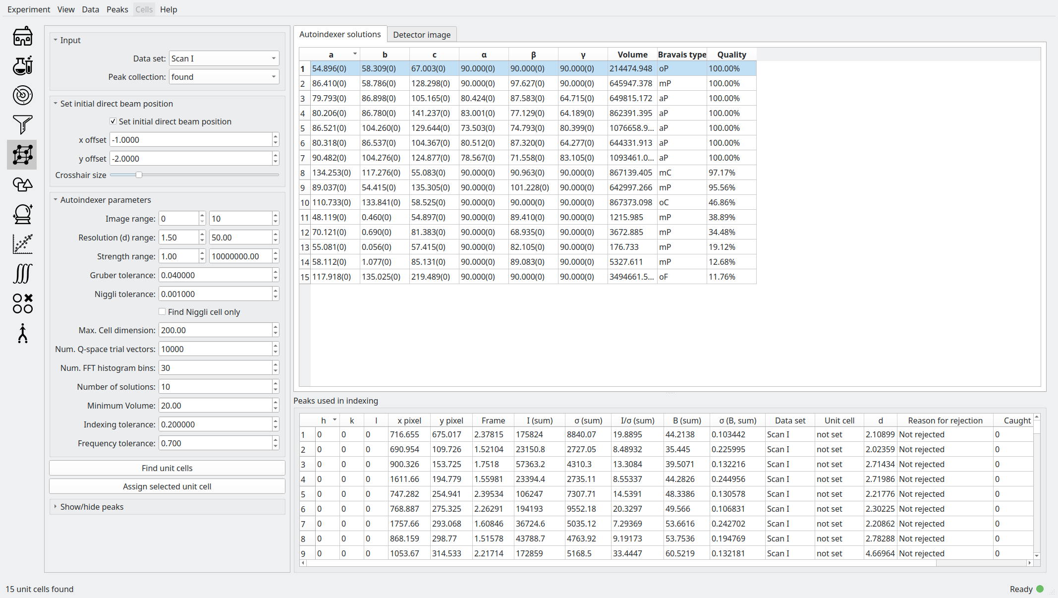 Since we’ve done the most important task of correcting the direct beam position, we don’t need to adjust the indexer parameters too much. We only use peaks from frames 0 to 10 to determine the cell (in fact, it is possible to do it with only one frame in general, but we need to specify a range, since OpenHKL generates a full 3D model). Adjusting strength and d range allows us to exclude weak and high resolution peaks that may hinder the indexing algorithm. The indexer generates a number of q-vectors over the unit sphere as candidate reciprocal basis vectors; the number of vectors is specified by Q vertices (10 000 is more than enough). For more problematic unit cells, it may be necessary to change Subdivisions, which controls the number of histogram bins used in the Fourier transform algorithm. Click on Find unit cells, then switch from the detector tab to the solutions tab.