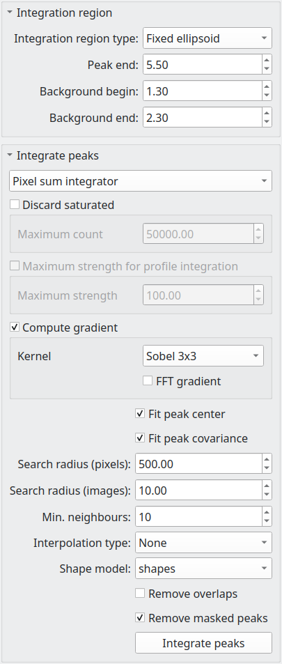 The crucial parameters for integration are the integration region bounds (peak end, background begin and background end). Here we choose the “fixed ellipsoid” integration region type, which means the ellipsoids defining integration regions have a fixed \(r_2\) metric given in pixels by the peak end value of 5.5. The background begin and background end values are scaling factors, such that the background region will be an ellipsoid scaled by the given values of 1.3 and 2.3 respectively. Check the Compute gradient box and integrate the peaks by clicking integrate peaks.