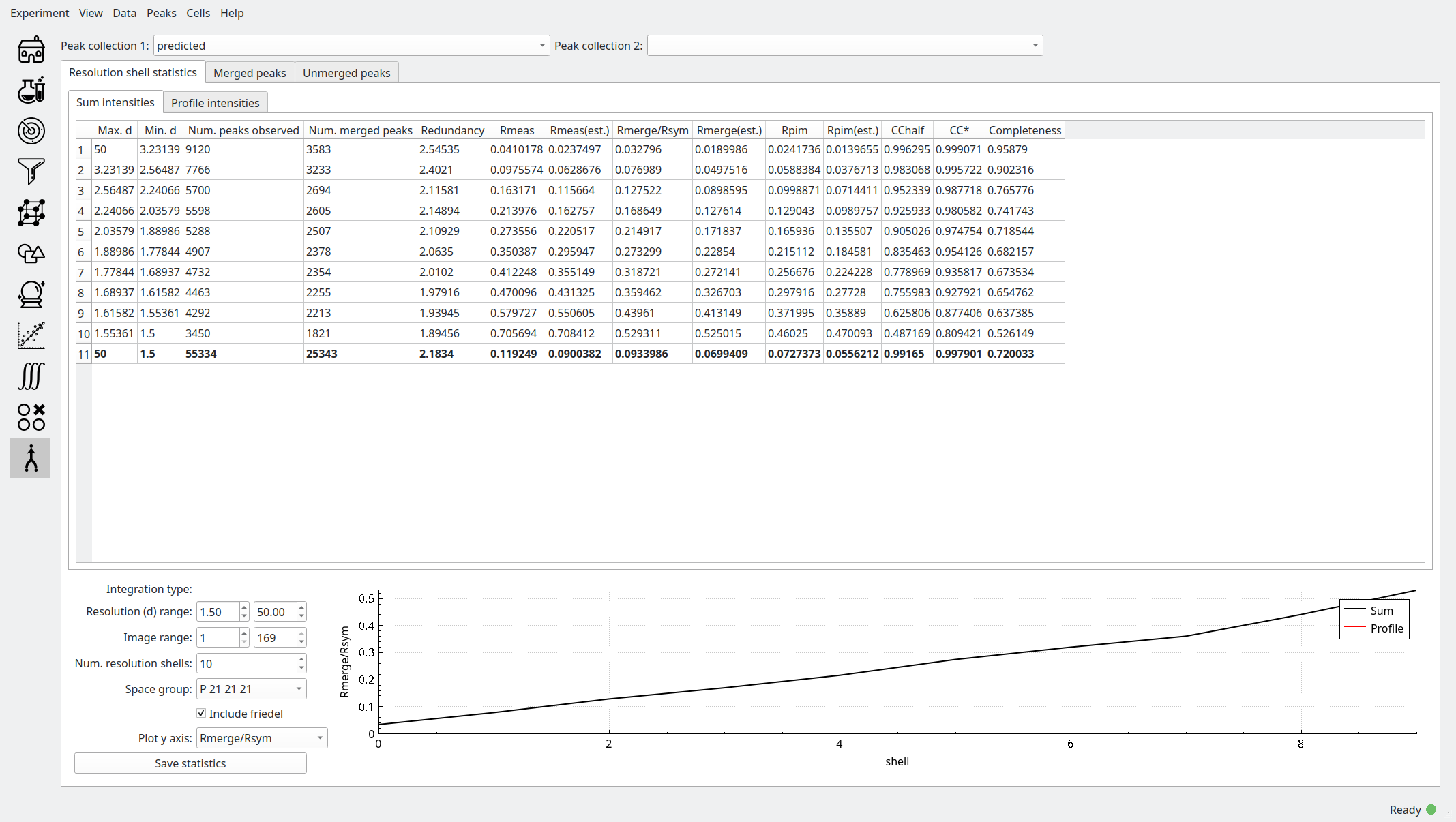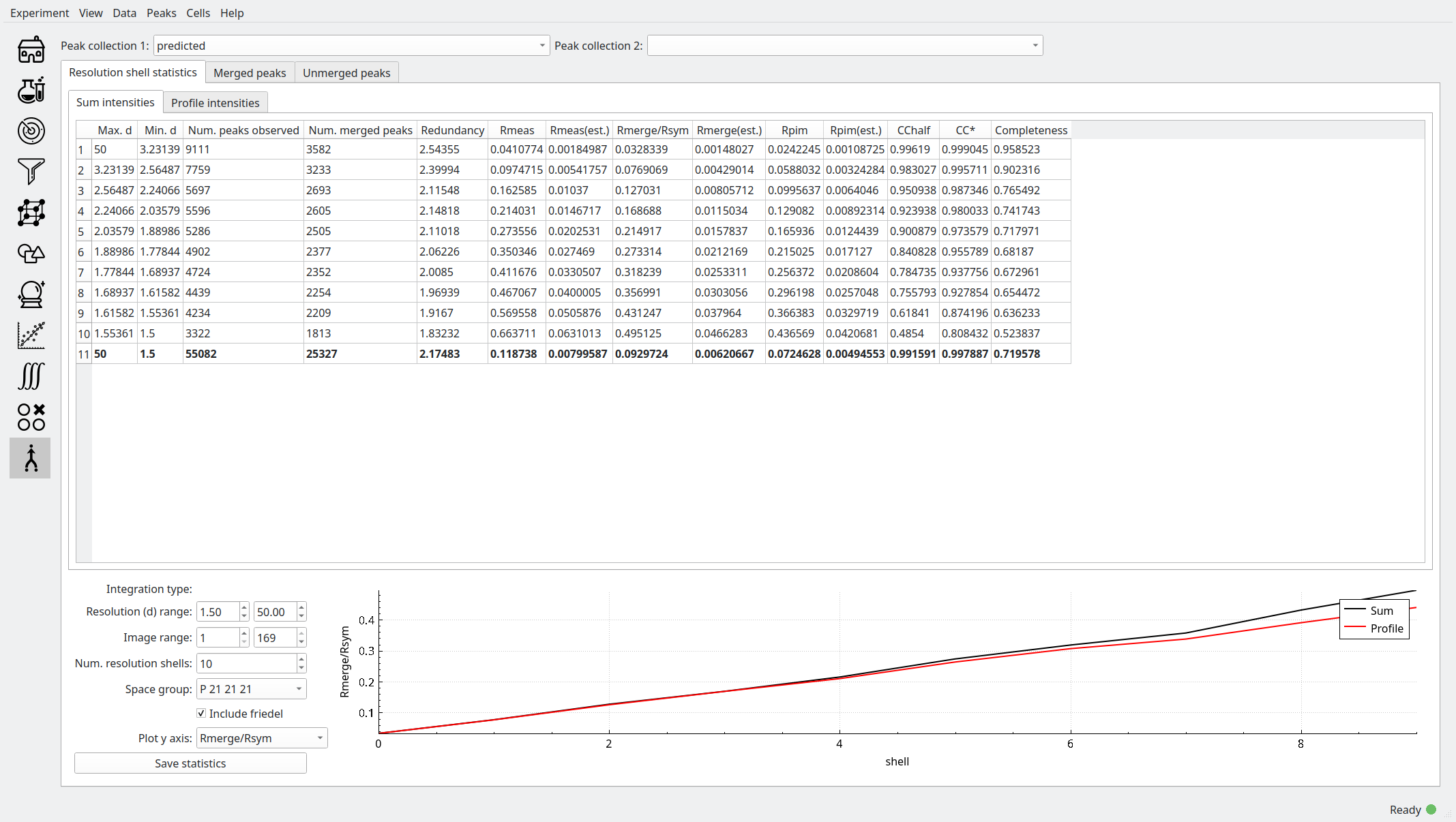 The reciprocal space in the resolution range 1.5 Å to 50 Å (in this instance) is divided into 10 concentric shells of equal reciprocal space volume, and the quality metrics computed for each individual shell, and for the overall volume. We also have the option of omitting the frames at the beginning and end of the rotation range, since the peaks here cannot generally be interpolated or are incomplete; however this is not usually necessary since such peaks are flagged as invalid.