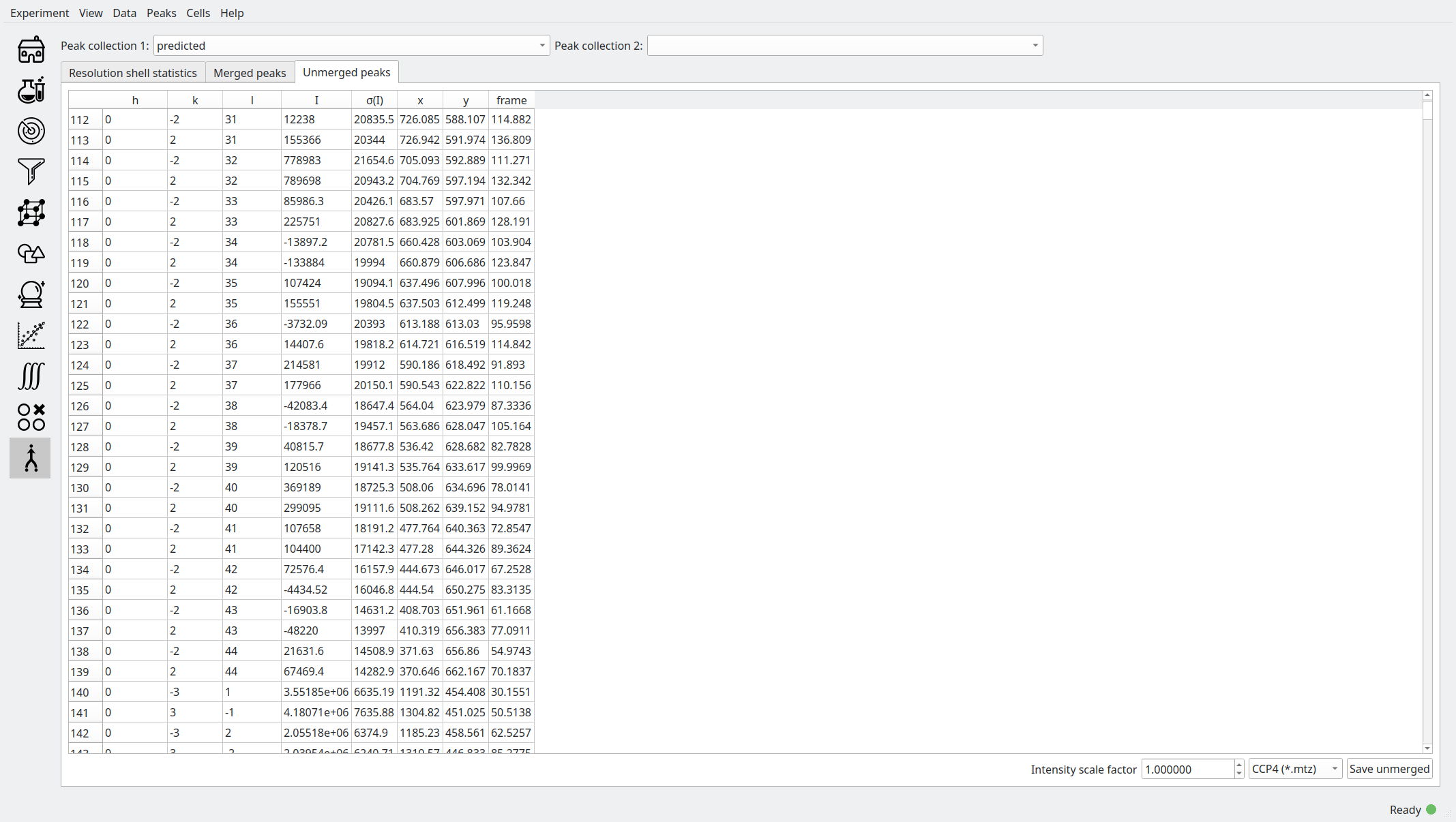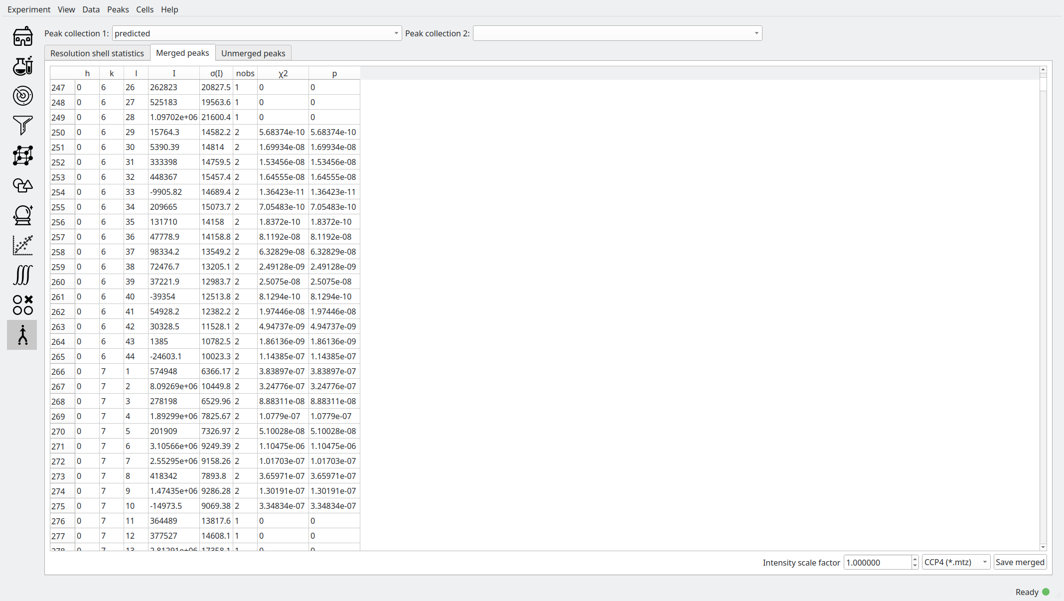 Finally, we can inspect the lists of merged and unmerged peaks by clicking on their respective tabs. The unmerged peak table is the essential goal of the data reduction process, and can be exported in various different formats to use in refinement of structural models; it is simply a list of peaks with their Miller indices, coordinates, intensities and sigmas. The merged peaks tab gives the redundancy, the number of symmetry-equivalent peaks for a given index, together with a “goodness of fit” parameter in the form of a \(\chi^2\) value.