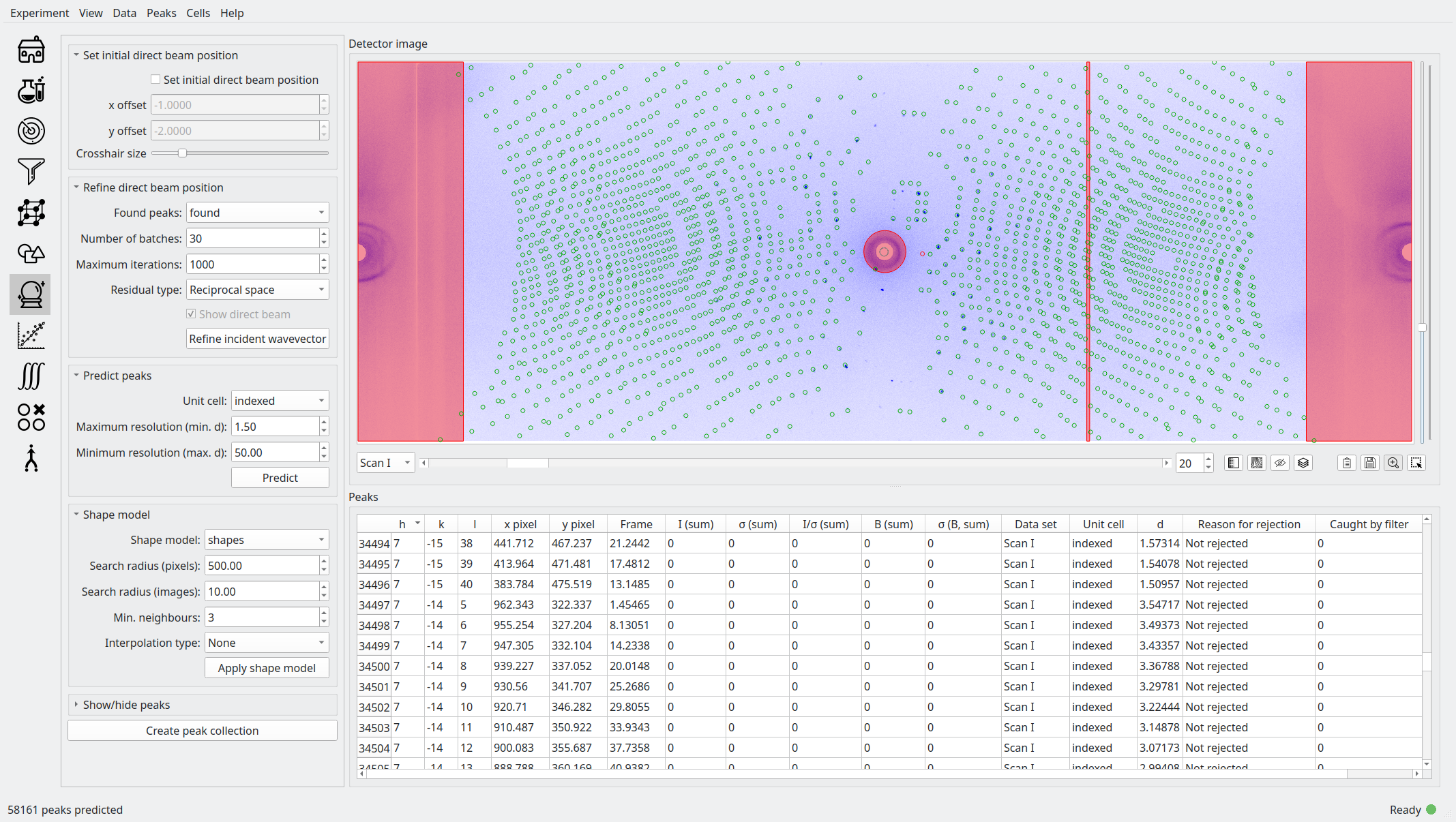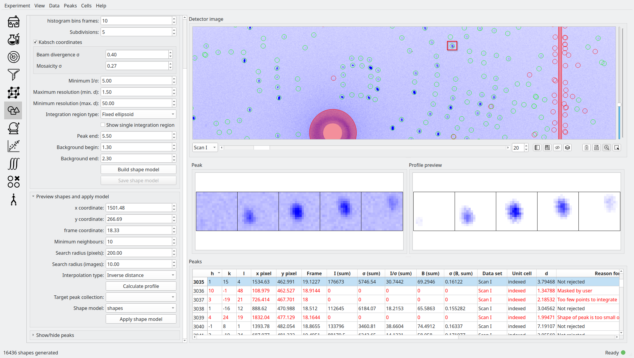 Note that after integration some peaks are marked as invalid; specifically, approximately 16802 out of 25318 peaks are valid (Note that this number might vary if your masks are not exactly the same as in the screenshot). We can check the reason for rejection column in the table to see why they were rejected. In the first few frames and last few frames of the data set, the reason is usually because the peak extends outside the sample rotation range and is therefore incomplete. Also note how peaks close to the rotation axis are often rejected, since they intersect the Ewald sphere on many images, and frequently extend outside the sample rotation range as a result. In any case, we have a good number of peaks, which we can use to both determine the unit cell and generate a good shape model. Finally, click on create peak collection and name the collection found.