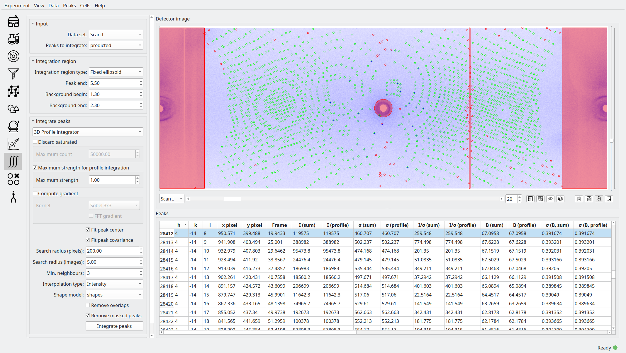 When the peak finding algorithm has finished, we should have identified 15316 peaks (this may vary slightly due to numerical imprecision and masking). At this point, we need to integrate the peaks. The default integration parameters are a good guess for most situations, but check the Compute gradient box so that the mean gradient in the background region is computed (this can be used later on to discard peaks with strongly inhomogeneous backgrounds). The shape of a blob can be characterised by an covariance (or inertia) matrix, and we simply rescale this matrix to determine the integration region. 3 is a good guess for the extent of the peak region (peak end) because we expect to find 99.54% of all counts within three standard deviations of the peak centre. After clicking on the integrate button and waiting, the intensity, \(\sigma\) and strength columns in the table of peaks will be populated. Note that we don’t want to make peak end too large, since we want to avoid overlapping intensity regions. The extent of the background region is less critical, since overlaps will not affect the results; however we want it to be large enough to get good statistics.