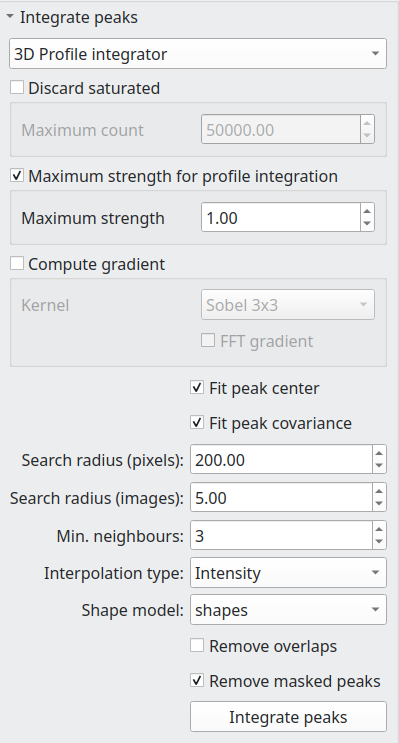 Choosing the correct neighbour search parameters is a delicate balancing act. Ideally we want a good statistical model for our weak peak, which means using as many peaks as possible to generate the profile. However, choosing an excessively large radius will degrade the model quality because of the spatial dependence of peak shapes, i.e. if our radius is large, we are more likely to include strong peaks that are far enough away to have radically different shapes. Moreover, we do not want to reintegrate strong peaks, since their shape is already well defined, and any attempt to scale the pixel values will simply make the integration quality worse. Therefore, we check the Maximum strength for profile integration box and set the upper limit to profile integrate a peak to a strength of 1. We can motivate this choice by looking at the peak statistics in the “reject” widget.