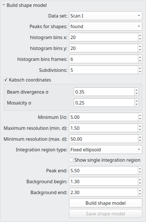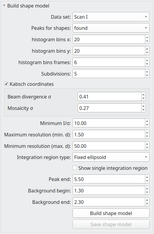 There are a few parameters that strongly affect the quality of profile integration; the first of these is the number of histogram bins used in constructing the mean profiles. The first of these is in the construction of the shape model: the default grid is 20 x 20 x 10, corresponding to the x, y and frame number coordinates respectively. Empirically, a lower value of the number of frame bins seems to work better, so construct a new shape model using a 20 x 20 x 6 grid (the parameters are pictured below).
