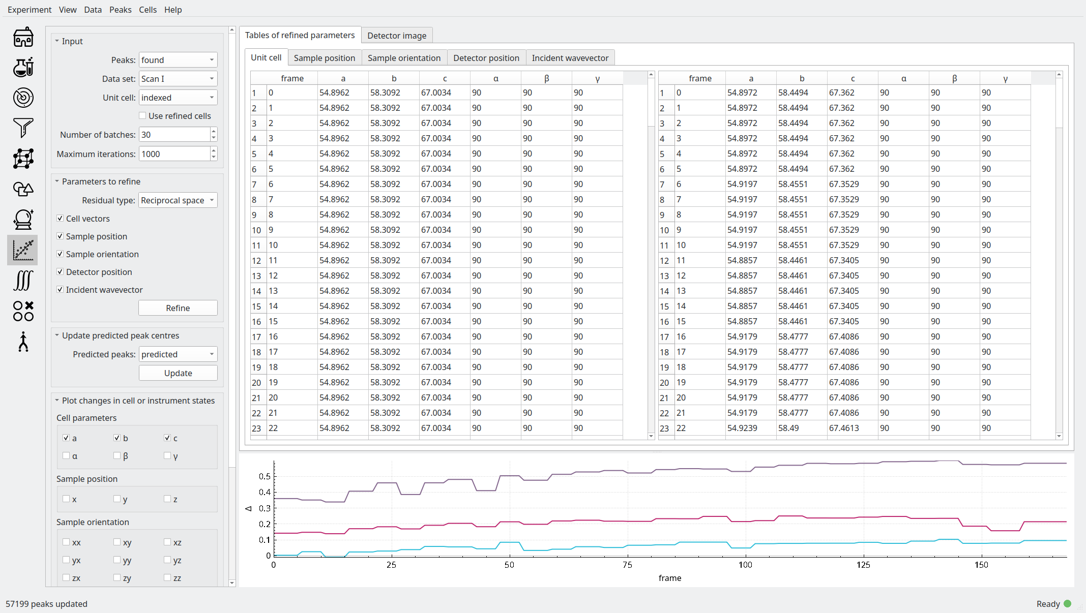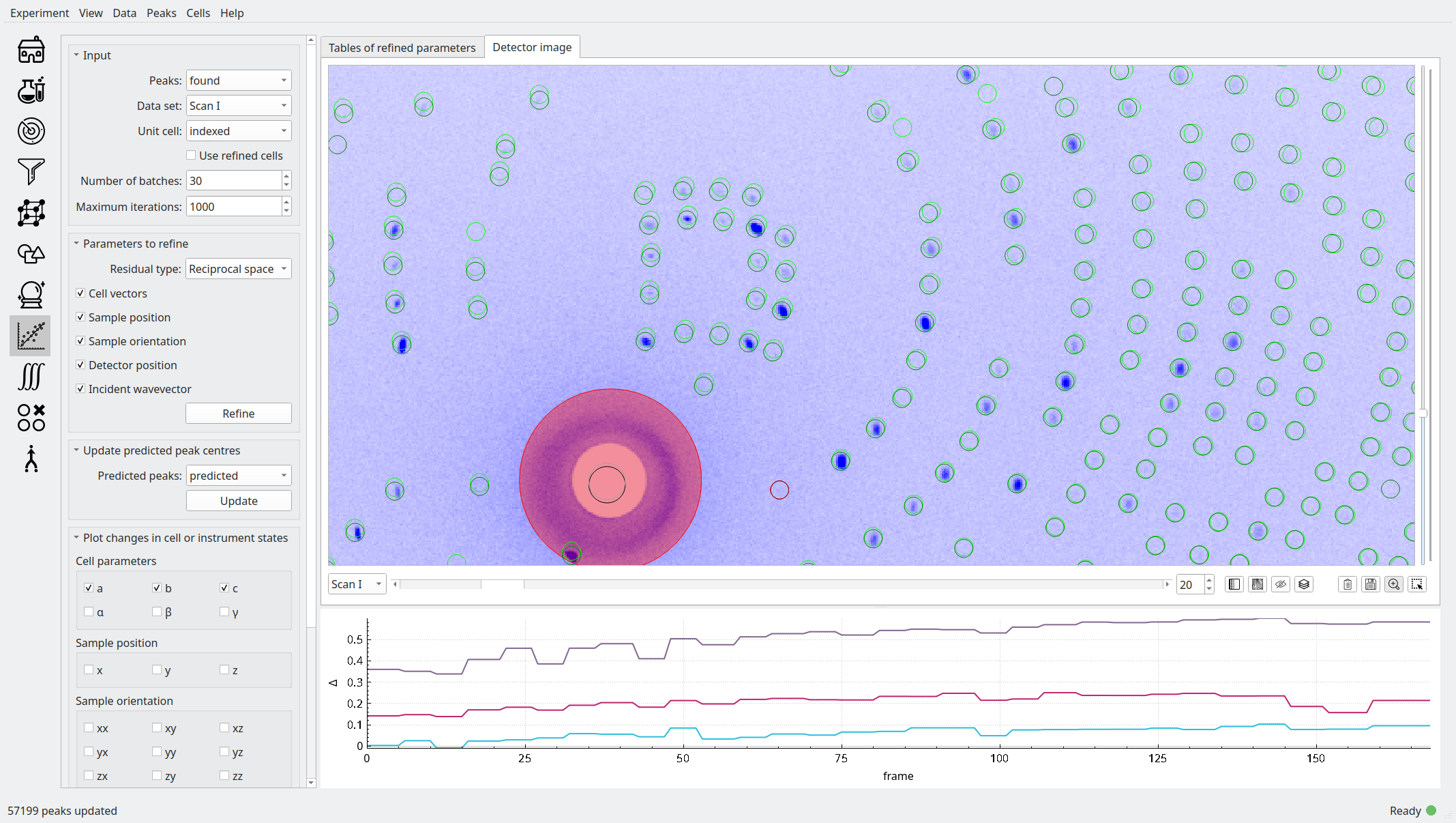 The change should be quite significant. You can see how the unit cells and instrument parameters change numerically as a function of rotation angle under the tables tab. We can try refining again, using the newly created “batch” unit cells as a starting point by clicking the use refined cells checkbox, then clicking refine again, followed by update. From the screenshot below, we can see not much has changed, but there are a few higher resolution peaks that have moved significantly.