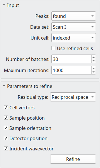 At this point, we need to ensure that our predicted peaks coincide with the spots on the detector images, to ensure that the integration is accurate. This can be achieved by refining the unit cell and instrument parameters (namely the incident wavevector, the detector position and the sample position and orientation). Click the Refine icon on the sidebar.