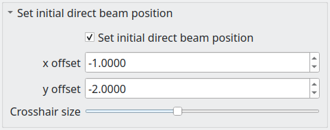 It is absolutely critical that the direct beam position is accurate to within a pixel or two at this point; if this is not the case, indexing will be very difficult, if not impossible. Click on the set initial direct beam position checkbox; this will allow you to drag and drop a crosshair, the size of which can be adjusted, on the detector image. The direct beam is by default at the exact centre of the image, but the air scattering halo in this data set is a better indicator of the “real” direct beam position. Adjust the crosshair size so that it can be used as a guide centre the direct beam, and reposition it as well as possible.