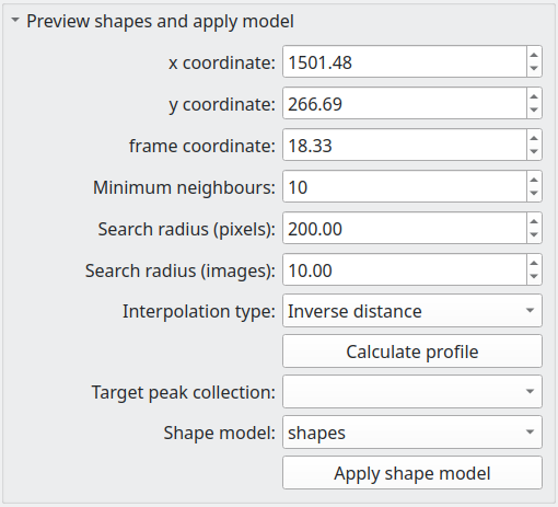 A shape generated at specific detector coordinates can be previewed using the shape preview widget. Here I have chosen the coordinates of a strong peak at coordinates (1501, 267, 18), and compute a mean shape within a radius of 200 pixels and 10 frames.