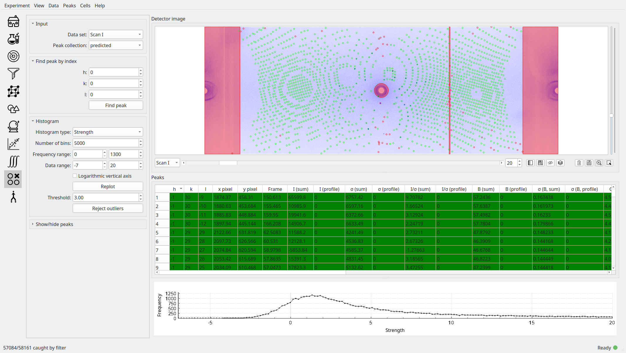 We can use this tool to plot a histogram of sum-integrated peak strengths. The vast majority of peaks have a strength lower than 10. Adjusting x-axis range on the plot filters the detector image to show the peak in that range in green, and any outside that range in red. By experimenting with this view, it should be possible to convince yourself that the peaks that are essentially invisible to the naked eye on the image have strengths below 1, although this value could probably be optimised somewhat.